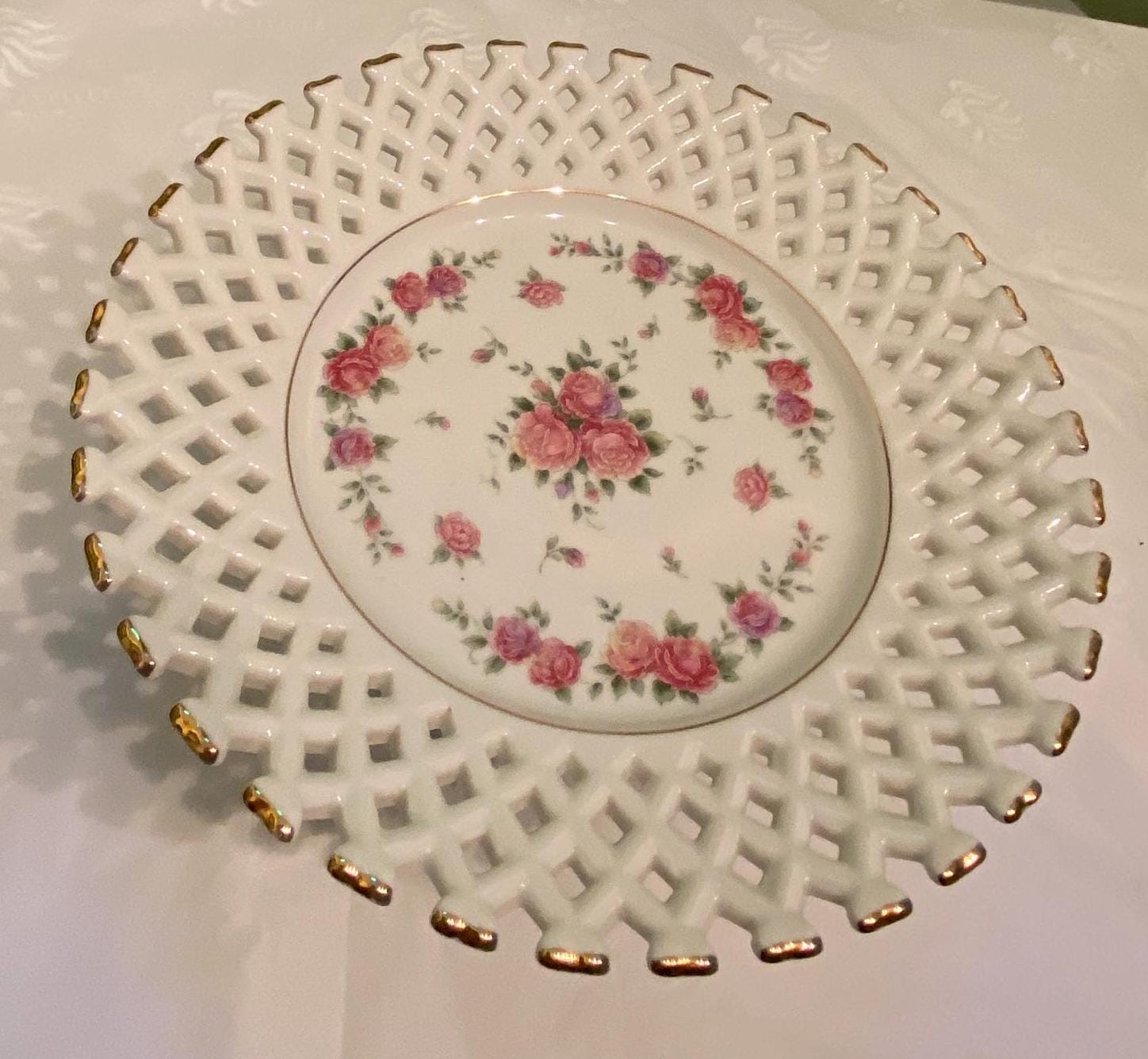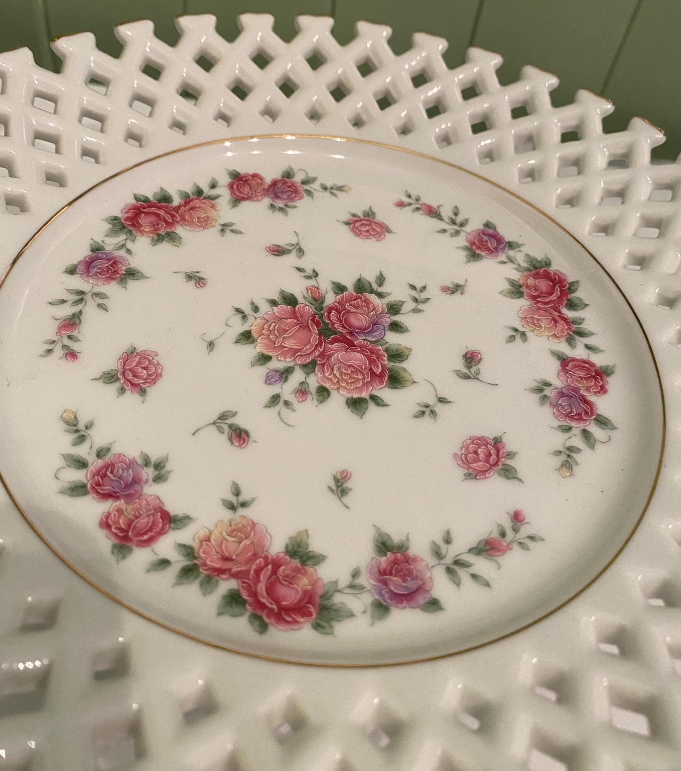 Lovely lattice work and decorated with pink roses and gold.