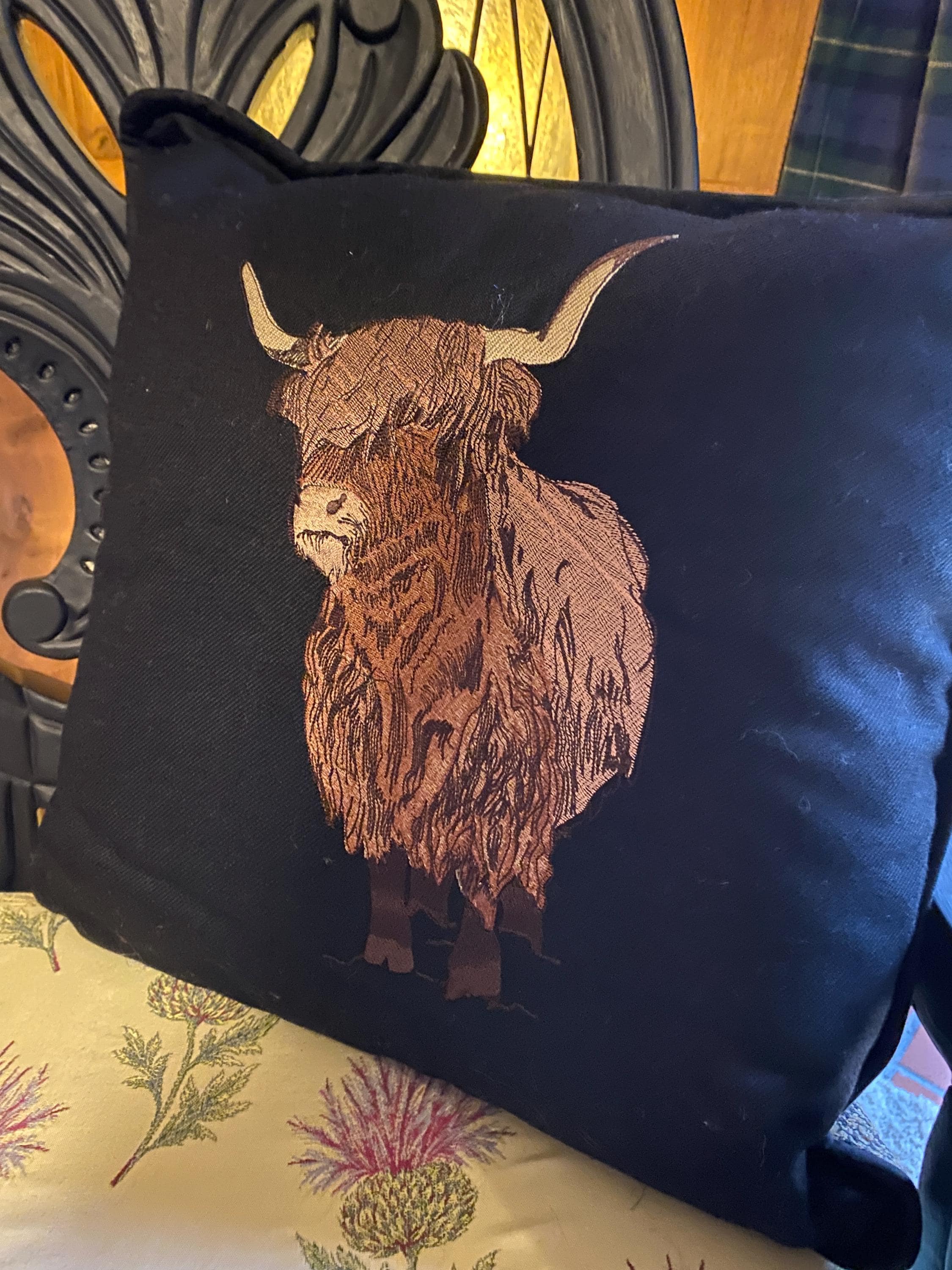 A unique cushion with a Laura Westville Highland Coo embroidered onto black pure new wool and crazy patchwork on the reverse side. The Highland Coo is based on an original artwork by Edinburgh based Scottish Artist Bun Boisseau.