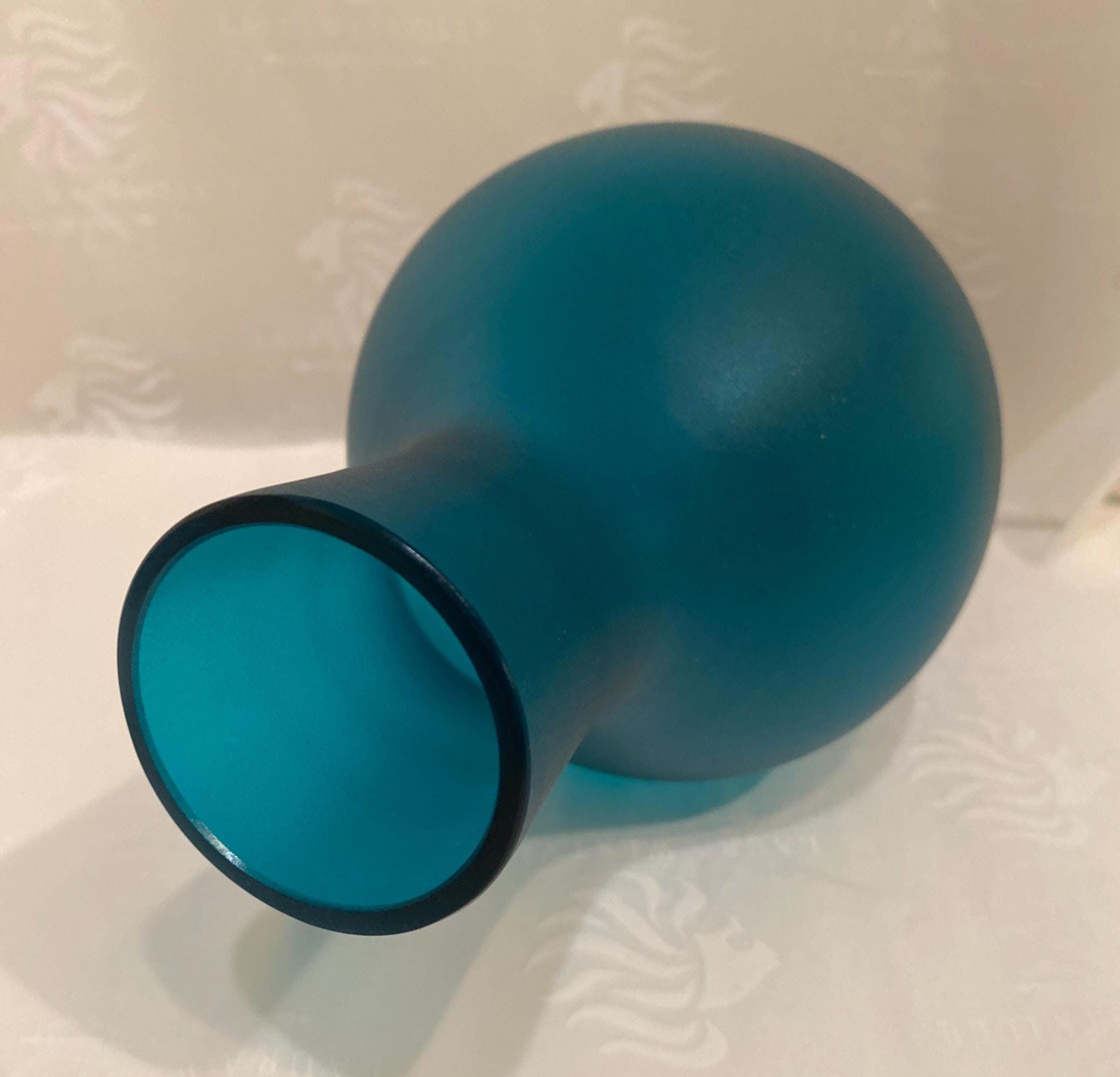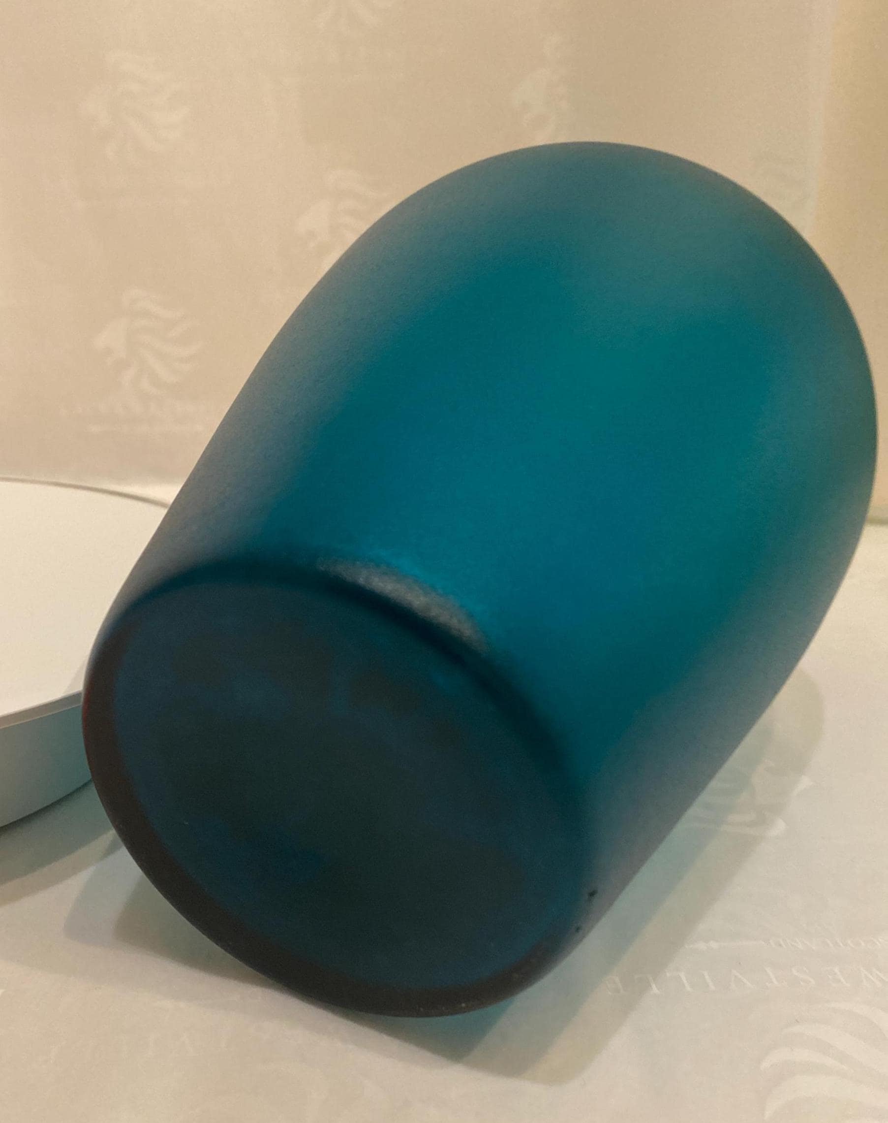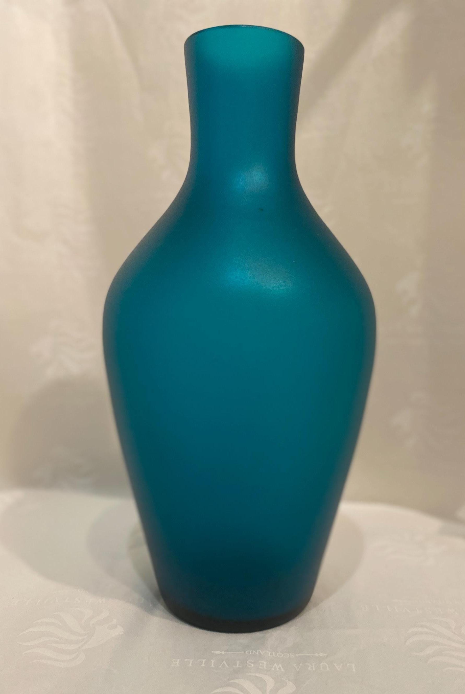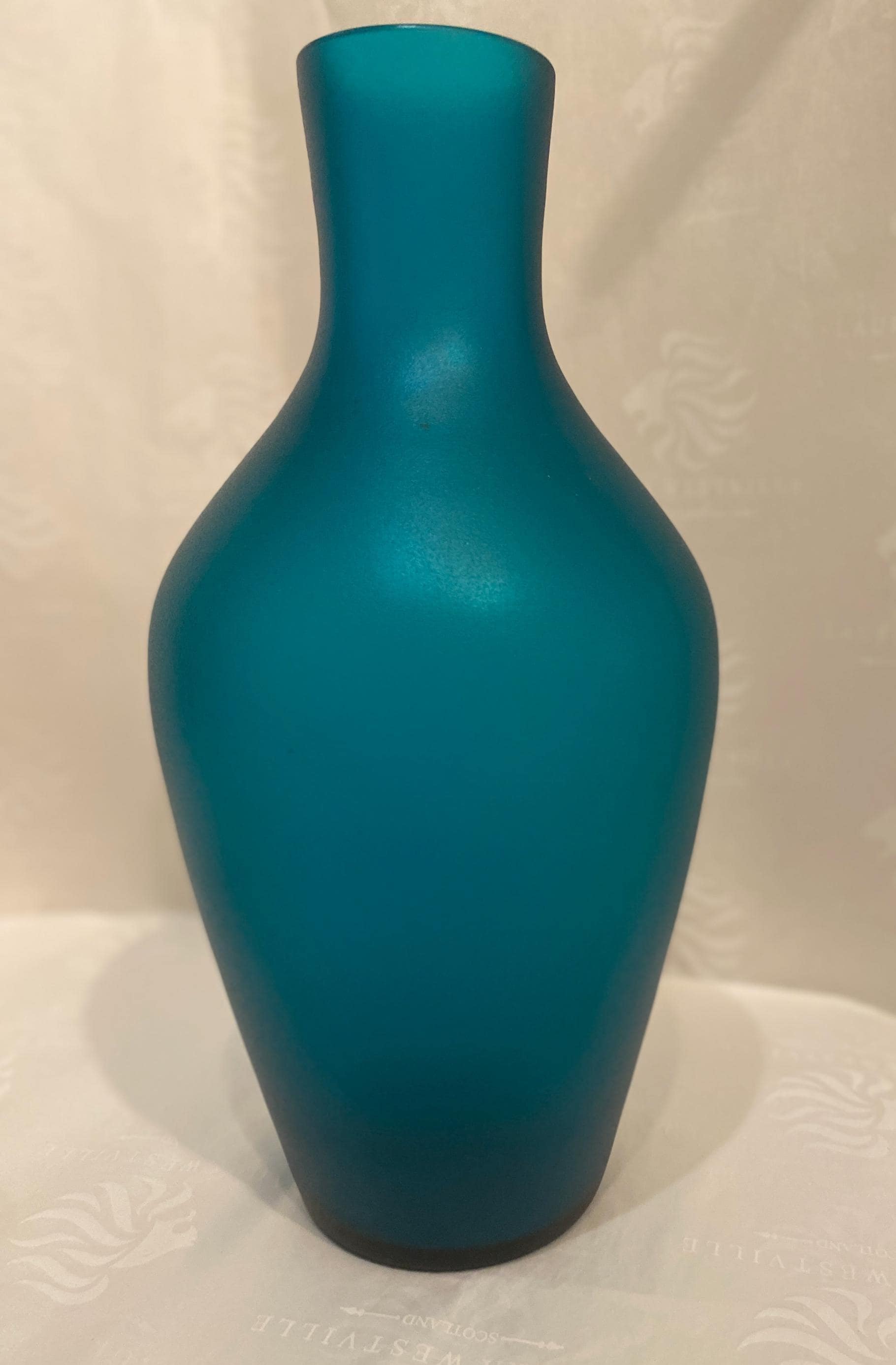 With a very attractive shape this beautiful hand crafted turquoise and navy blue vase is one of a kind with a very interesting two tone colour effect depending on what angle you view it from. The perfect vase to display fresh or dried flowers at a window or as a wonderful standalone retro displayed object.